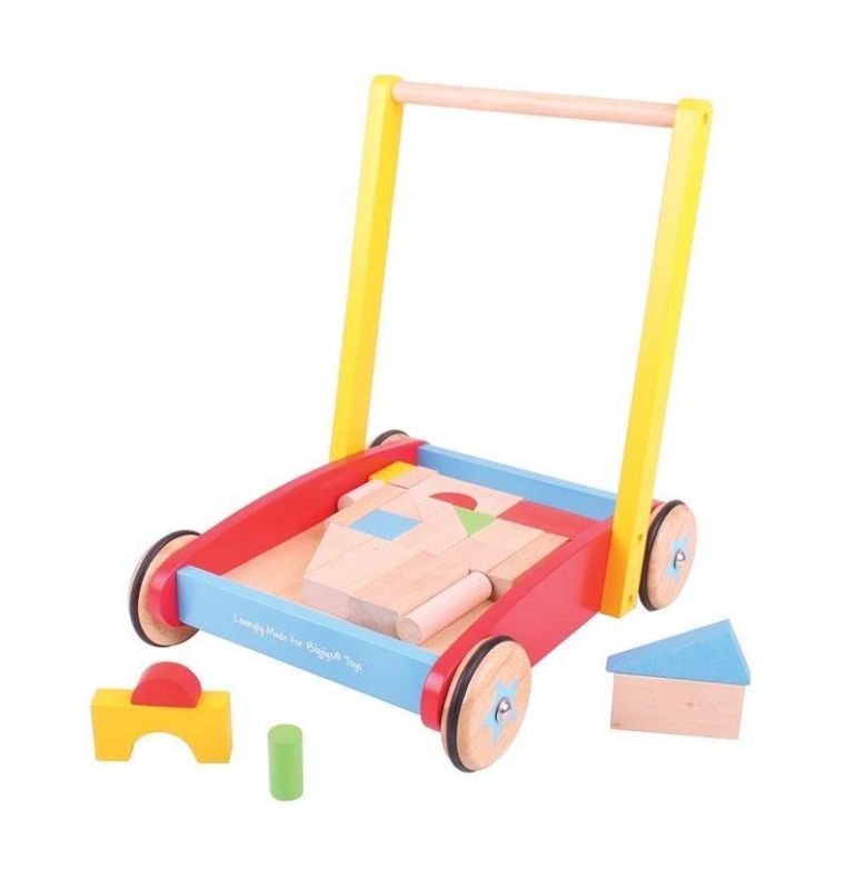 Wspaniały, drewniany pchacz wraz z klockami! Idealny dla dzieci uczących się chodzić. Dziecko czuje się bezpieczne, ponieważ może trzymać się obiema rączkami wózka. W środku jest miejsce na układanie różnych kombinacji klocków. Idealny prezent na roczek!