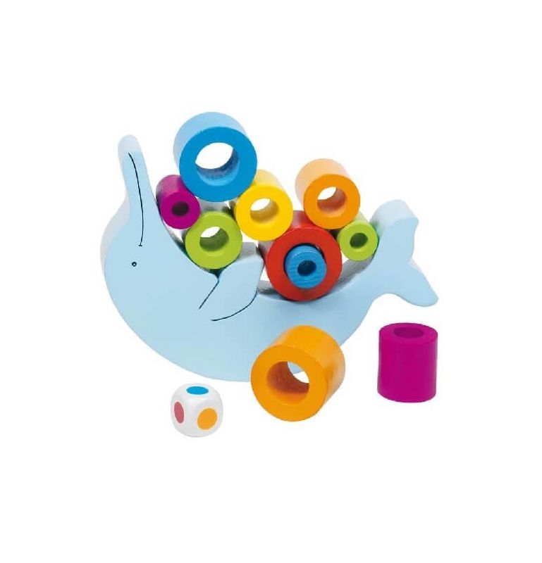 Delfin jest równoważnią, na którym należy ułożyć kolorowe kółka tak by zachować równowagę.