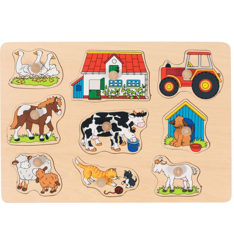 Układanka o tematyce farmy. Zadaniem dziecka jest dopasowanie ciągnika oraz zwierząt żyjących w gospodarstwie domowym do odpowiednich otworów. Każdy element posiada duży uchwyt, żeby dziecko mogło poćwiczyć sobie także chwytanie. Jeżeli szukasz ciekawego i jednocześnie bezpiecznego prezentu dla swojego dziecka to świetnie trafiłeś!