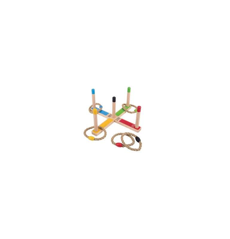 Zestaw zawiera pięć obręczy, pięć palików do ustawienia oraz dwie deski, które po złożeniu utworzą krzyżaka. Zabawa polega na rzucaniu obręczy na słupki. Obręcze mają zaznaczone kolory i żeby nie było zbyt łatwo, naszym zadaniem jest trafienie daną obręczą w odpowiedni słupek.