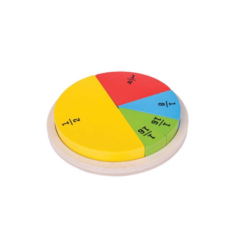 Doskonały zestaw by wytłumaczyć dziecku pojęcie części ułamkowych! Główną częścią zestawu jest drewniane koło, które składa się z pięciu klocków: pierwszy klocek stanowi 1/2 całości, drugi 1/4, kolejny 1/8 oraz dwa ostatnie klocki, które stanowią po 1/16 całości. Każdy ułamek zaznaczony jest innym kolorem. Dzięki graficznej formie dziecku będzie łatwiej opanować zarówno pojęcie ułamka jak i podstawowe działania na ułamkach zwykłych.