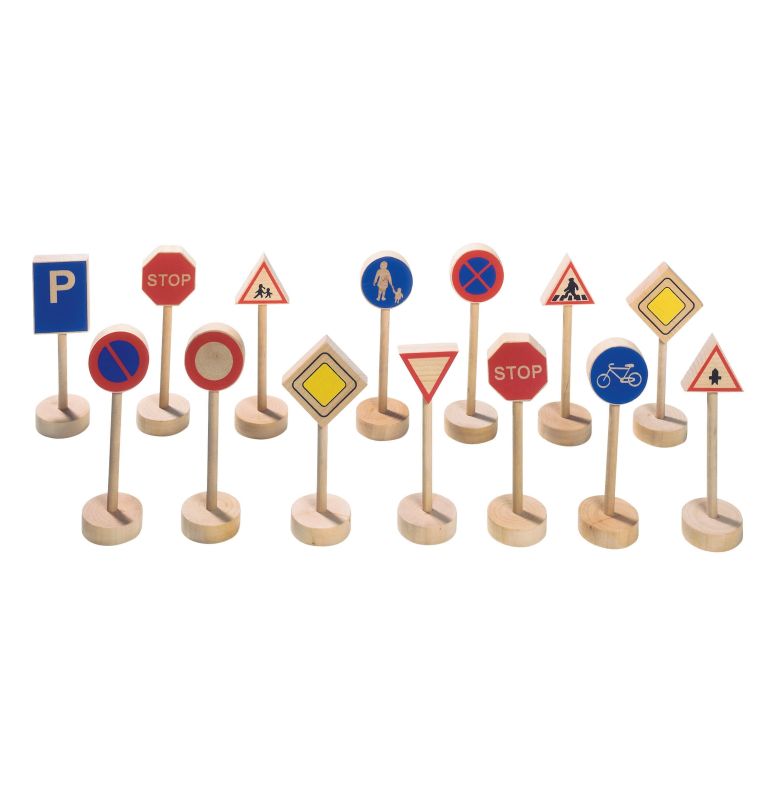 Komplet 15 drewnianych znaków, które przybliżą Twojemu dziecku przepisy ruchu drogowego. Zestaw można połączyć z wybranym torem kolejkowym ale można również uzywać samodzielnie lub z innymi zabawkami.