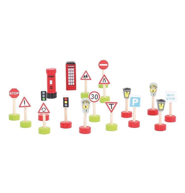 Komplet 10 drewnianych znaków, które przybliżą Twojemu dziecku przepisy ruchu drogowego.