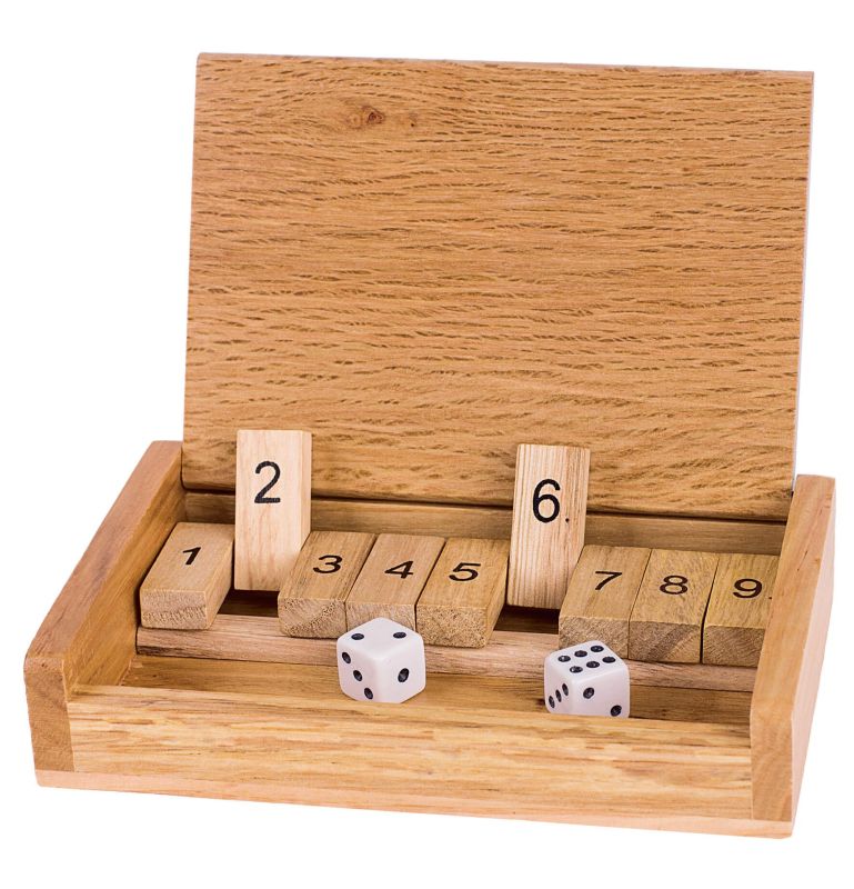 Podróżna gra w kości. Rzucamy dwiema kostkami i wyrzucone cyfry możemy zamknąć. Celem gry jest zamknięcie całego pudełka – opuszczenie wszystkich cyfr. Genialna gra dla całej rodziny!