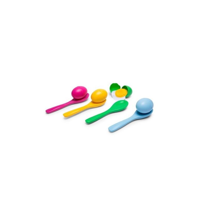 W zestawie znajdują się 4 kolorowe jajka 75mm (skorupka wykonana z plastik, białko-żółtko z materiału 100x100x10mm) , 4 kolorowe łyżki 200x50x15mm (plastik)