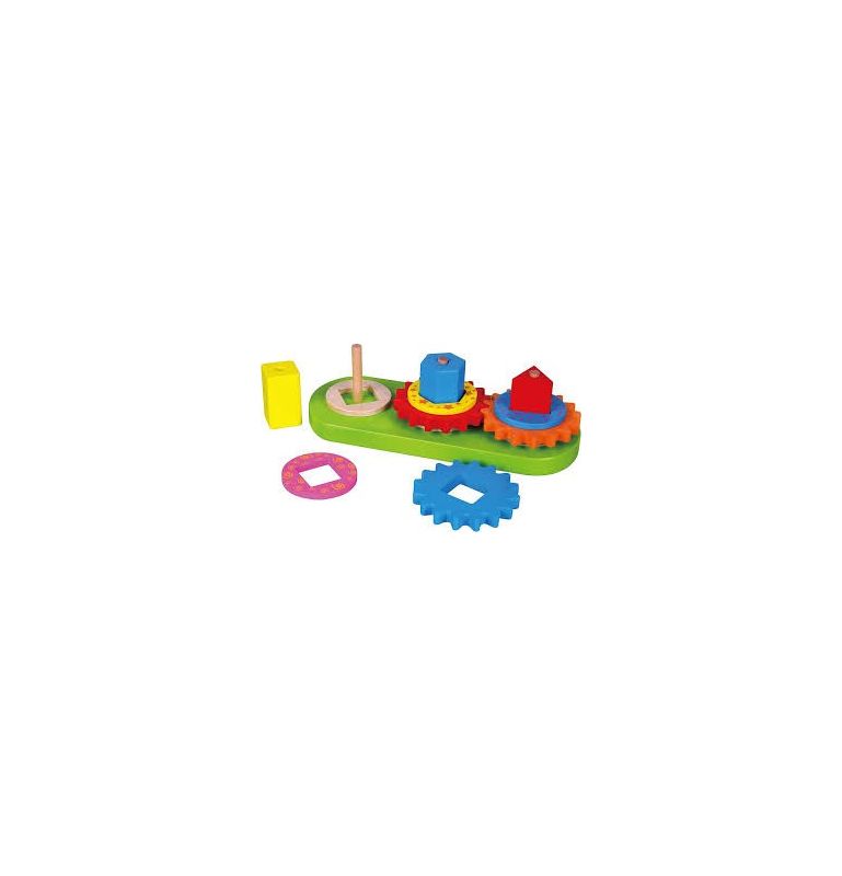 Zestaw zawiera koła zębate oraz klocki i płaskie elementy o różnych kształtach. Zadaniem malucha jest ułożenie elementów na trzy kołeczki w taki sposób, żeby pasowały one do siebie i koła zębate mogły się obracać. Elementy są kolorowe i posiadają różne kształty - dziecko potrenuje również rozpoznawanie kształtów i kolorów. Maluch może także obrysowywać kontury klocków na kartce papieru.