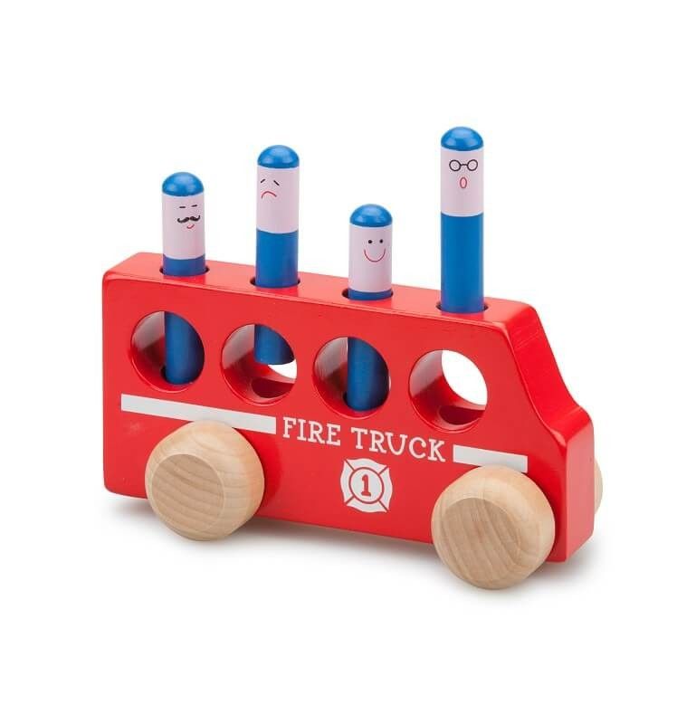 Genialny prezent dla roczniaka! Zestaw zawiera wóz strażacki wraz z pasażerami. Ludziki po naciśnięciu wyskakują - świetna zabawa dla każdego malucha! Produkt został wykonany z drewna i został pokryty farbą na bazie wody.