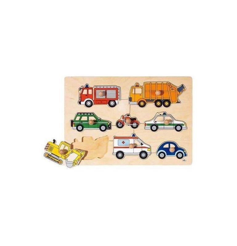 Drewniana układanka ze środkami transportu. Zadaniem malucha jest dopasowanie odpowiednim kształtem do danego otworu. Pojazdy posiadają specjalne duże uchwyty, dzięki którym roczniaki radzą sobie już z tym wyzywaniem.