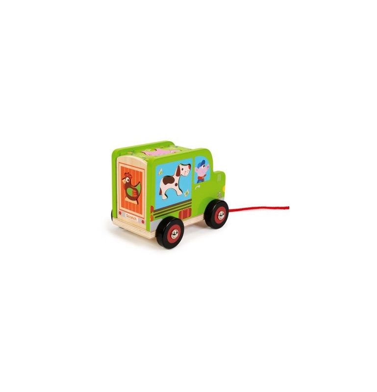 Wóz farmera to jednocześnie idealna zabawka do ciągnięcia, wyposażona z sznurek i cztery kółka.
