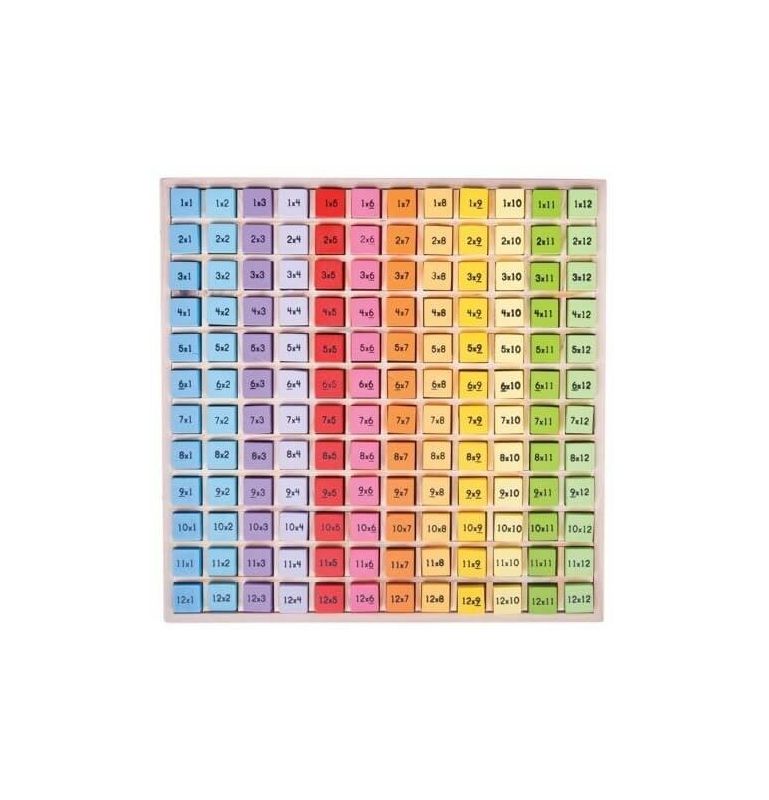 Na planszy umieszczone są kosteczki z działaniami mnożenia (od 1 do 12) a na odwrocie każdej kostki, widnieje odpowiedź. Każda liczba w pionie, zaznaczona jest innym kolorem. Tablica jest bardzo przejrzysta i z całą pewnością pomoże dziecku w nauce tabliczki mnożenia.