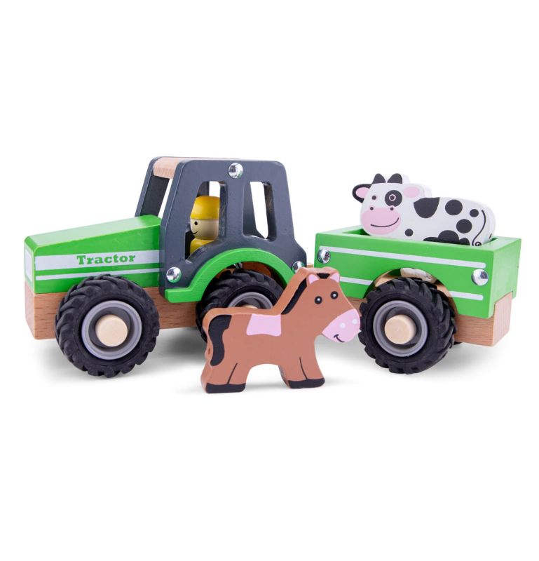 Solidnie zbudowany zestaw: ciągnik z kierowcą, przyczepa oraz krowa i konik.