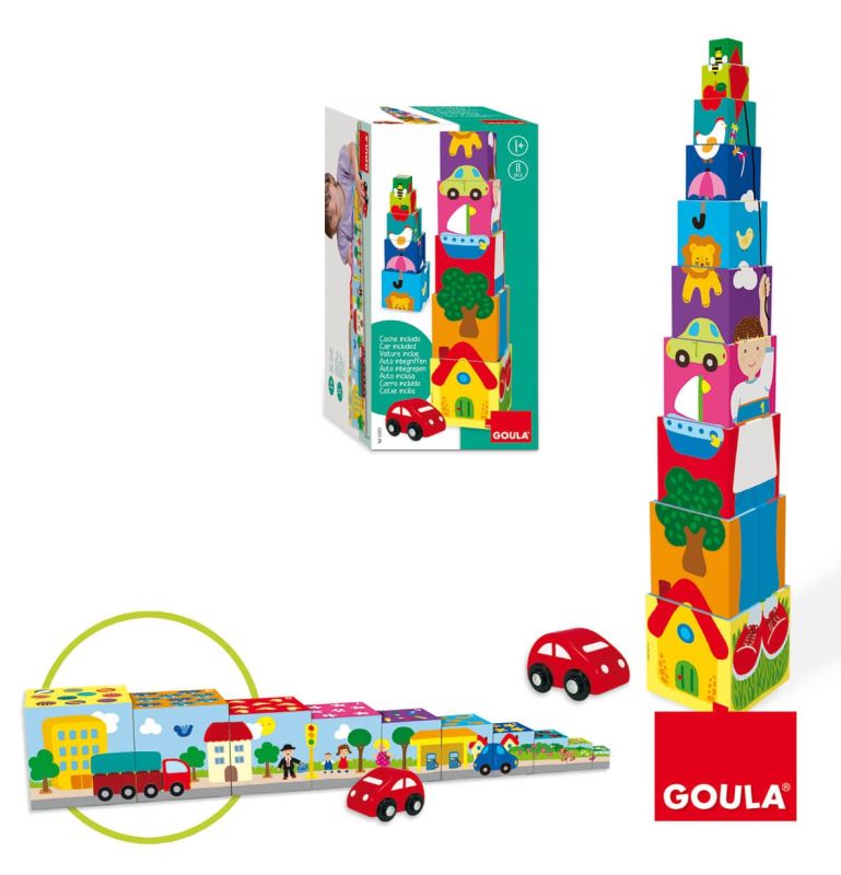Zestaw zawiera 10 kostek wieżowych. Zadaniem dziecka jest ułożenie kostek od najmniejszej do największej. Dodatkowo kostki powinny tworzyć logiczną całość. Zabawką można bawić się etapami: możemy pozwolić układać kostki dowolnie, a dopiero w późniejszym wieku dziecko może przejść do trudniejszego etapu i układać kostki w logiczną całość. Dzięki temu zabawka będzie służyć na dłużej. Zestaw zawiera również autko. Każdy maluch ucieszy się z takiego prezentu!