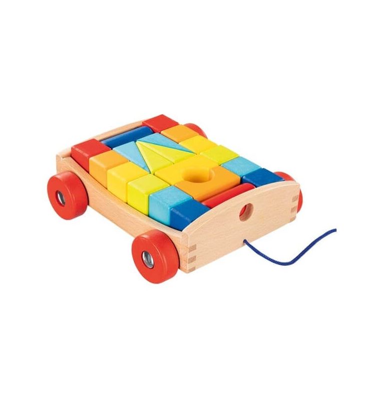 Wózek do ciągnięcia z zestawem 20 kolorowych drewnianych klocków.