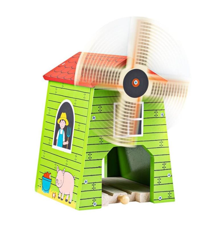 Świetny dodatek do Twojej kolejki. Zielony drewniany młyn z pewnością zainspiruje małych entuzjastów kolejek drewnianych.