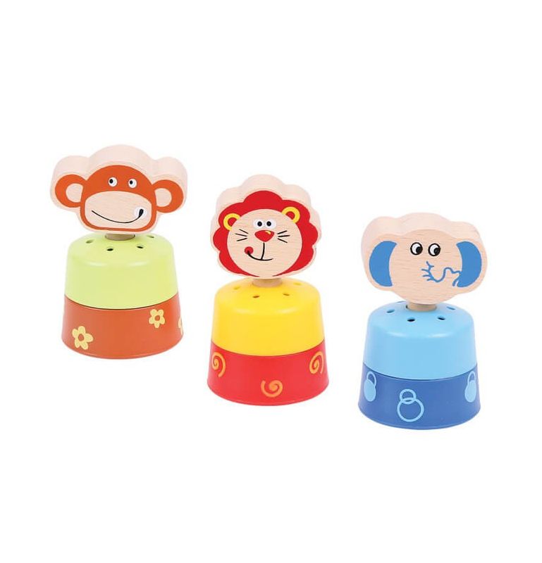 Świetny drobiazg dla roczniaków! Zabawka występuje w trzech wersjach: słoń, lew, małpa. Każde zwierzę po naciśnięciu na główkę wydaje dźwięk.